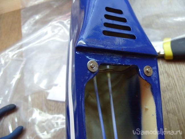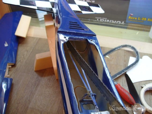 Полностью вынимаю его из фюзеляжа и размечаю другое отверстие для его монтажа в хвостовой части. Затем тонким надфилем прорезаю отверстие в другом месте и под другим углом выхода.
