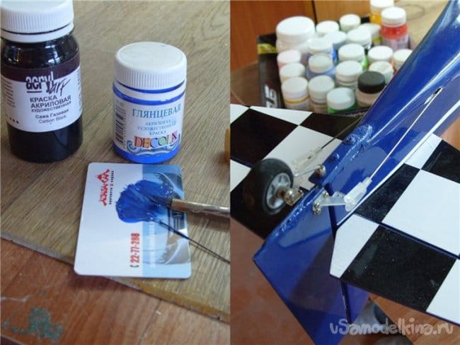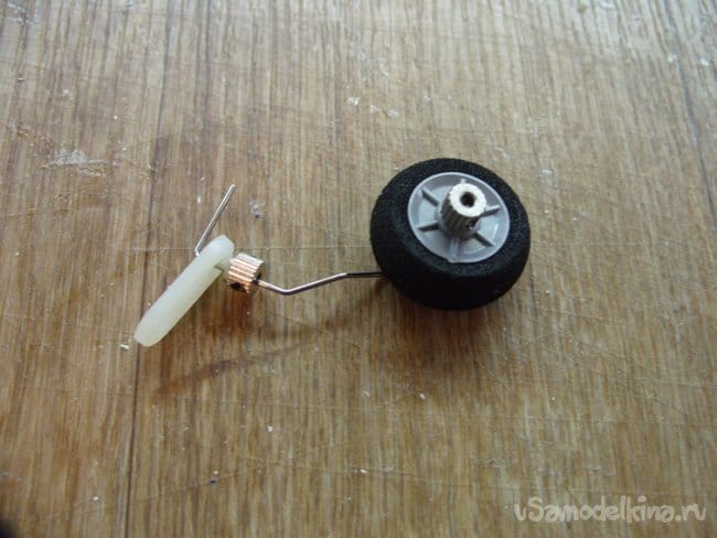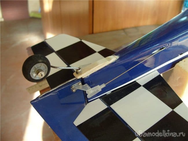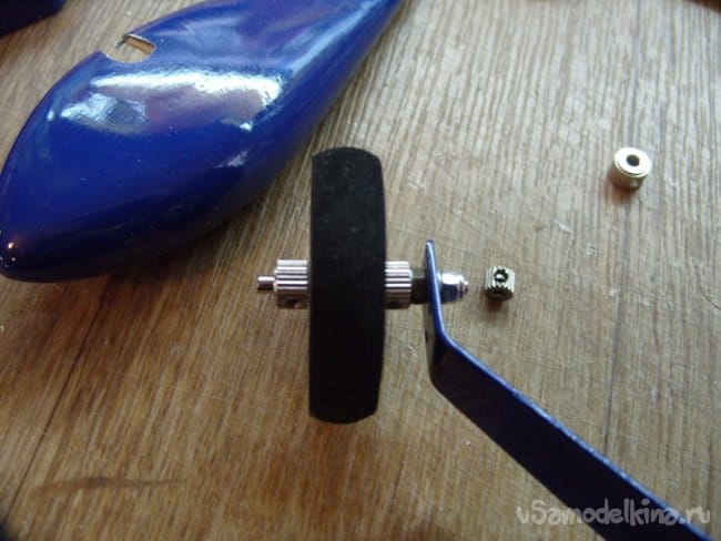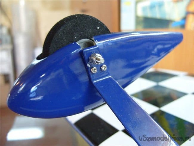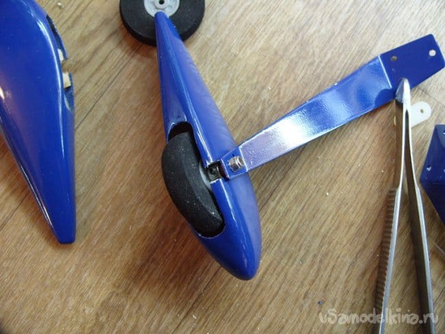 Заднее рулевое колесико не вызывает оптимизма, слишком жидкое. Пришлось переделать на более прочный вариант, на фюзеляж наклеил фанерку, куда закрепил новое колесо и закрасил ее синим акрилом.