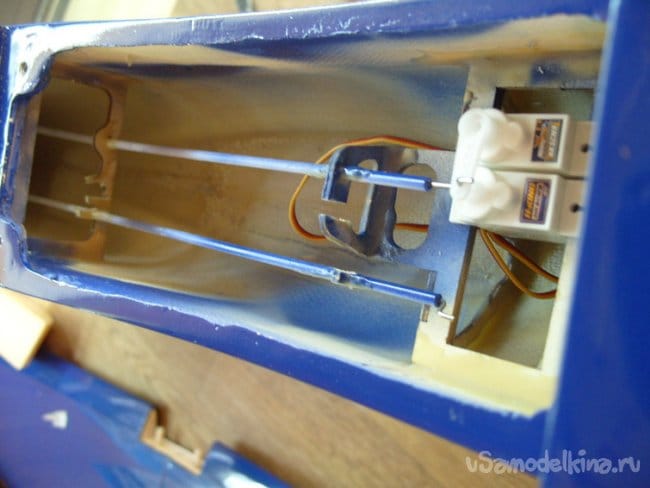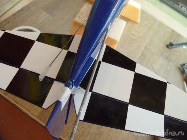Обращаюсь к фюзеляжу. Нужно продеть тяги на руль высоты и направления во вклеенные в стенки боудены. Не вставляются. Очевидно при формовке фюзеляжа часть эпоксидки попала в отверстия боуденов. Затачиваю кончик тяги и начинаю нежно и акуратно высверливать эпоксидку из трубочки боудена. Операция увенчалась успехом.
