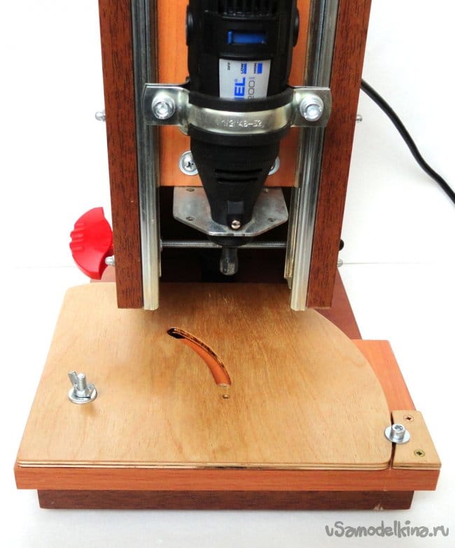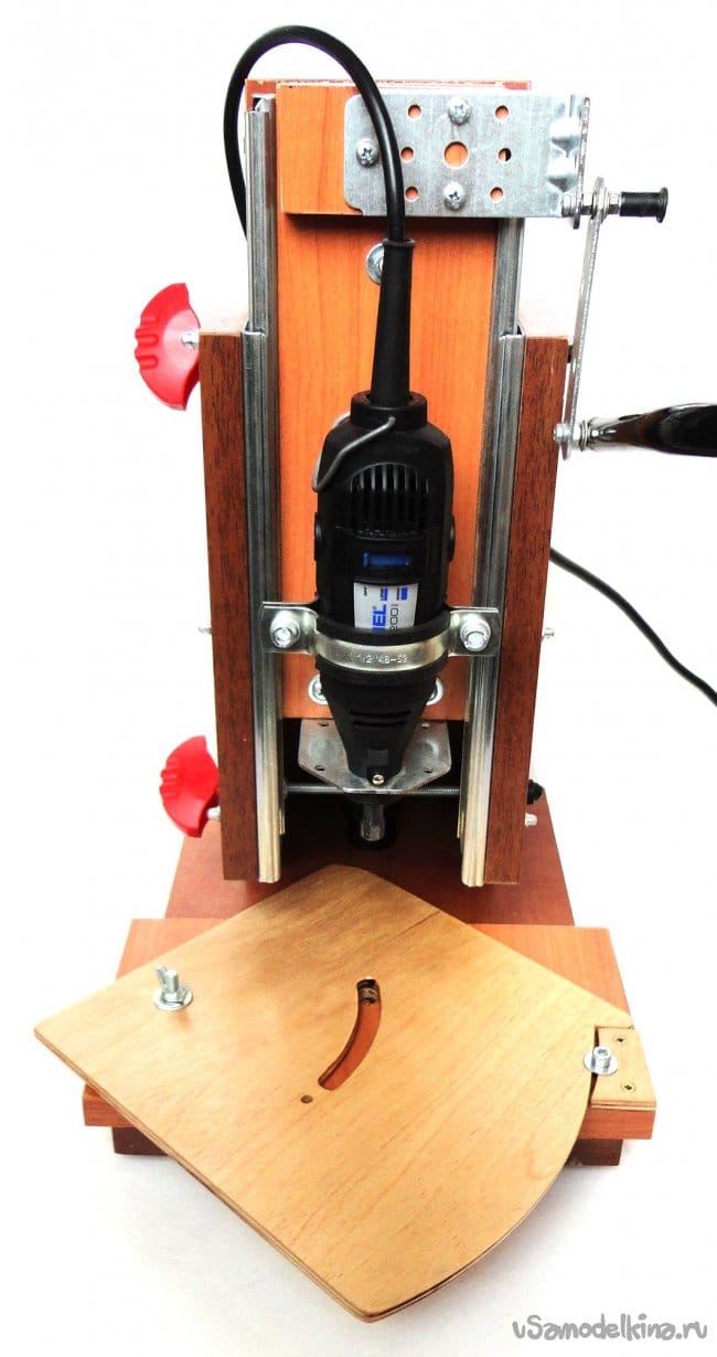 На момент написания данной статьи получившееся приспособление к вышеуказанному станочку для МФИ «Dremel» показывает достаточно хорошие результаты в надежности и удобстве использования. Хорошо держит возникающие нагрузки, пока не разбалтывается. При работе очень удобно использовать ранее изготовленный модуль педалей для управления электроинструментами.