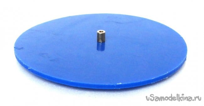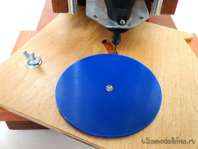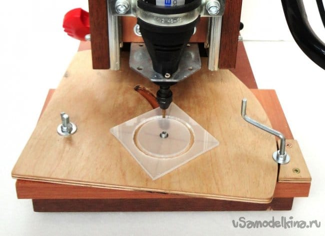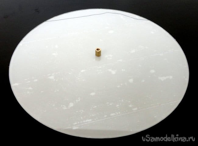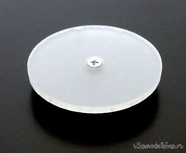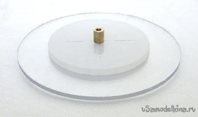 Для возможности изготовления деталей, не предусматривающих, каких либо отверстий в центре, была изготовлена вращающаяся площадка диаметром 48мм (по ширине стандартного рулона двустороннего скотча). Площадка была сделана из матового пластика (оргстекла) толщиной 3мм. Отверстие в центре обработано зенкером под шляпку винта в потай.