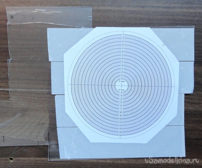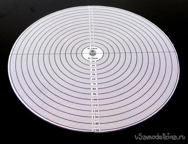 Для удобства использования конструкции, на лазерном принтере была распечатана «радиусная» линейка. Которая с помощью двустороннего скотча была наклеена на прозрачный пластик толщиной 1,5мм. После грубой обрезки ножницами по металлу была обработана с помощью данного приспособления. Линейка пронумерована в единицах радиуса и диаметра. Соответственно шаг радиуса составляет 1мм, шаг диаметра составляет 2мм. Таким образом, при резке заготовки необходимый диаметр (или радиус) устанавливается по режущей кромке используемой фрезы.