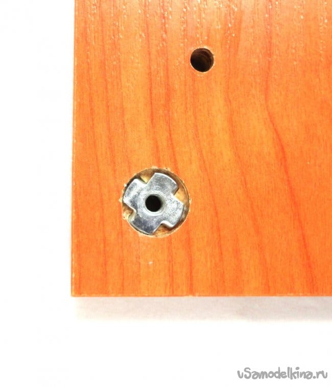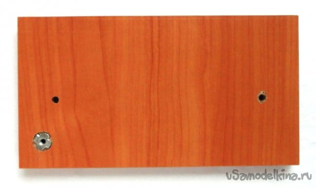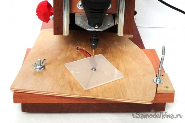 Приспособление решил сделать в виде съемного опорного столика под уже имеющиеся крепежные отверстия в основании ранее сделанного станочка для МФИ «Dremel». Основание столика изготовлено из готового куска ЛДСП размерами 242х130х16мм. Крепежные отверстия просверлены под винты М6. Для фиксирующего винта установлена усовая мебельная гайка М5, которая заглублена с помощью перьевого сверла диаметром 16мм. Разметка отверстий производилась сразу по месту, поэтому с размерами особенно не заморачивался.