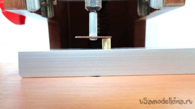 Поворотная ось (центр) для заготовок длинной 6мм, изготовлена из круглой латунной стойки для печатных плат, диаметром 5мм, под винт 3мм (т.к. готовой стойки, необходимой длинны, под рукой не было). Для точности изготовления использовалось простейшее приспособление из «П» образного профиля.