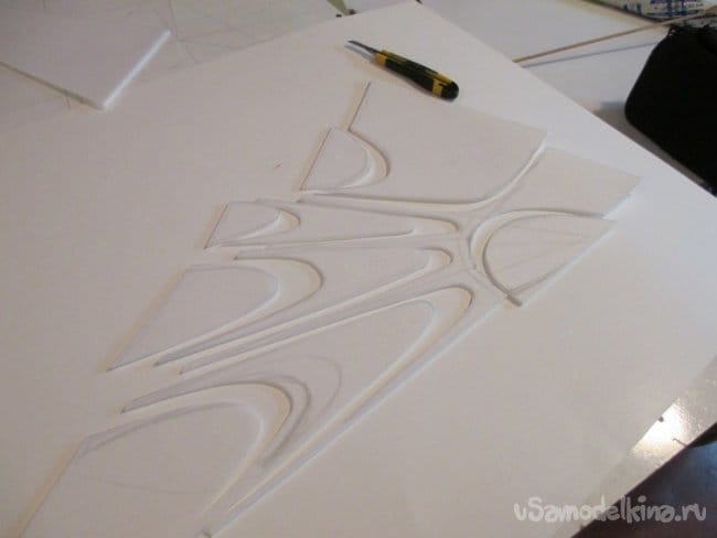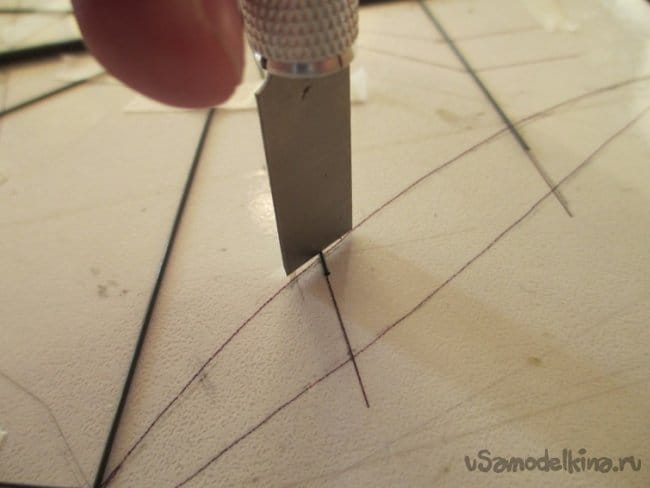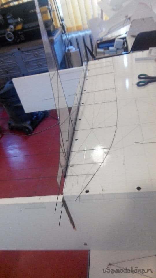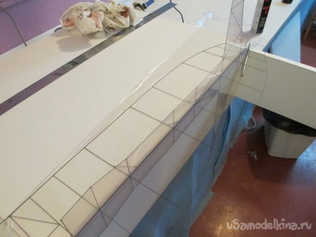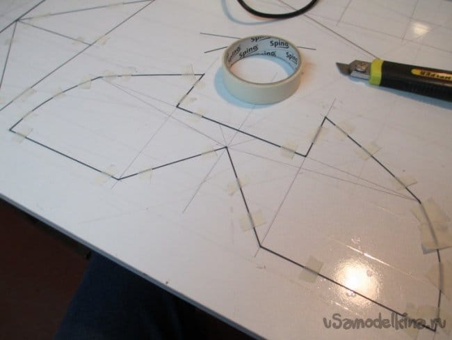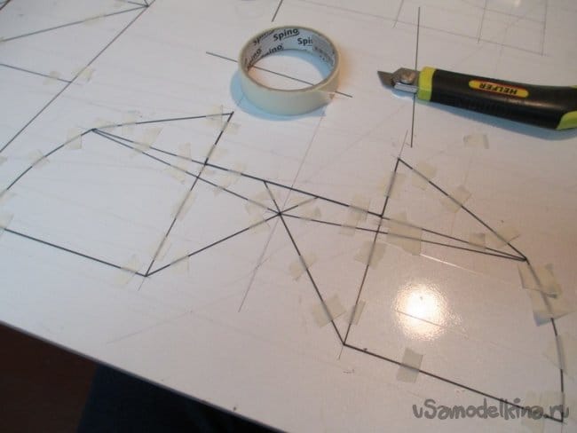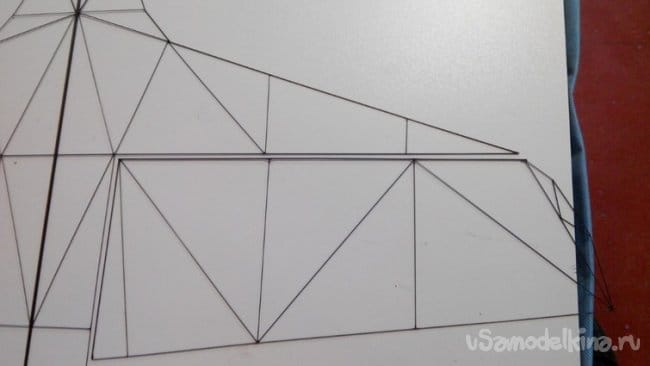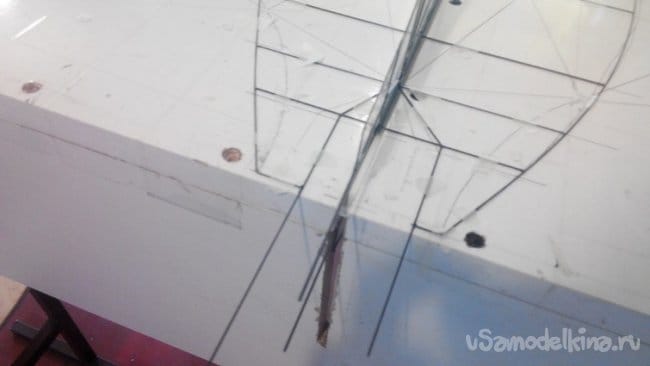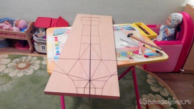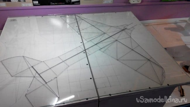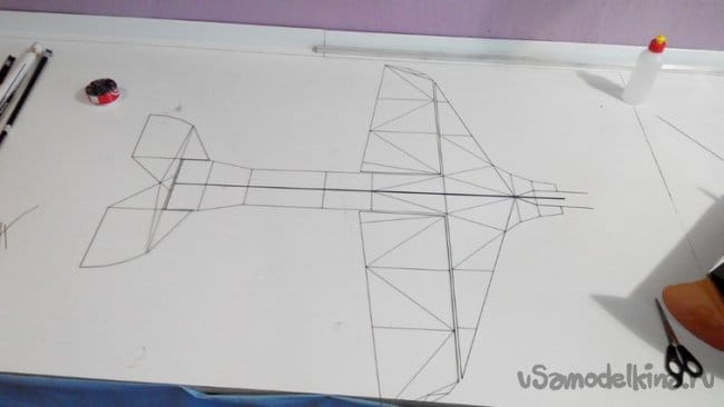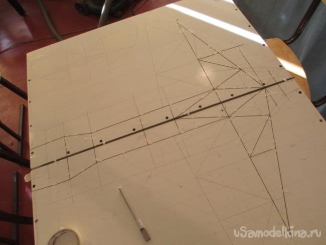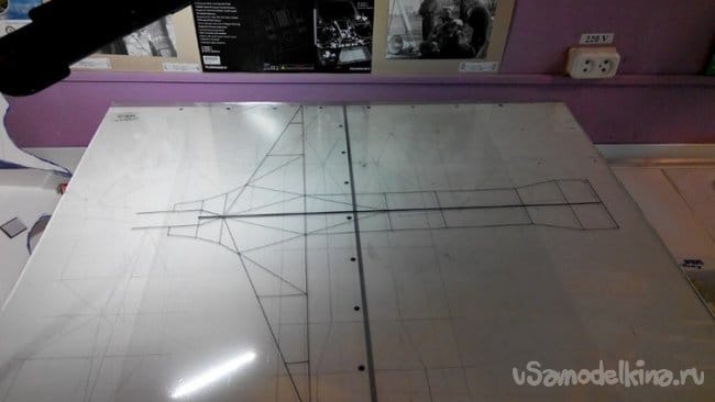 Чертеж горизонтальной составляющей модели и крыльев перенесен с кальки на стапель обыкновенной шариковой ручкой. При необходимости ненужную линию можно просто стереть салфеткой смоченной в спирте.