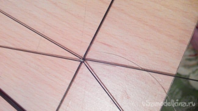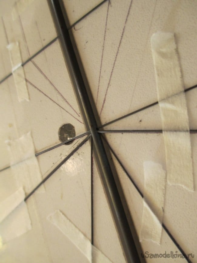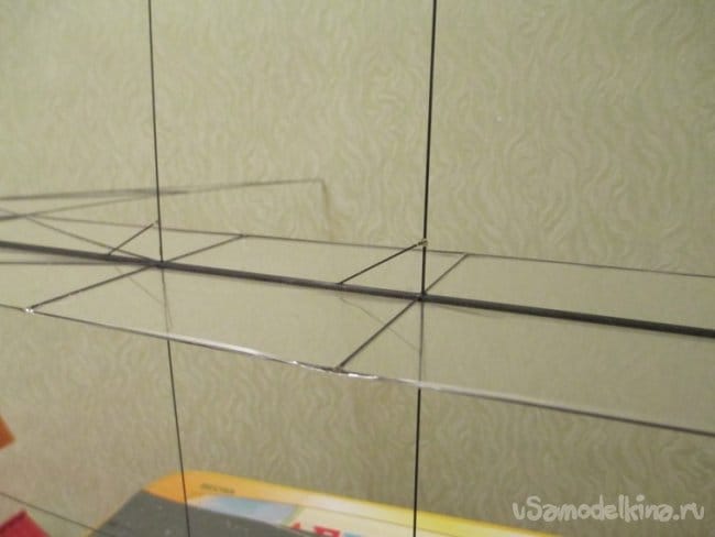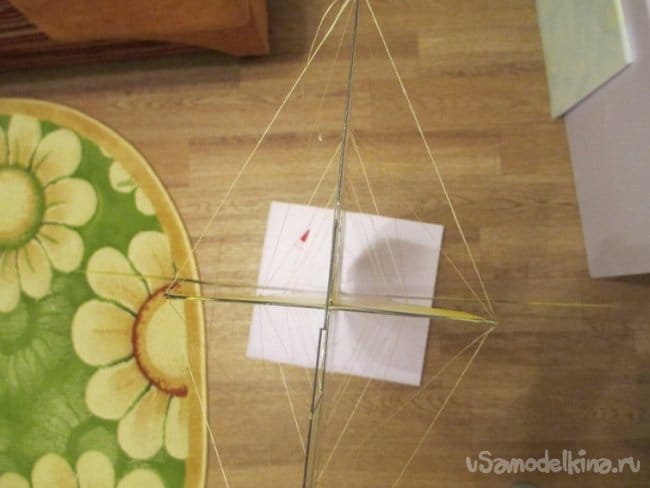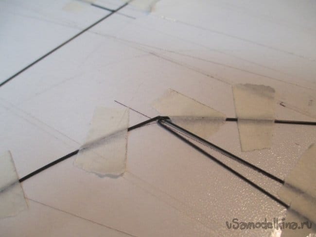 Первым делом в местах установки растяжек аккуратно счищаю пленку приклеенную к прутикам надфилем. Поскольку циакрин приклеивается только к углю. Натягиваю первыми перпендикулярные нитки затем из этих точек крест-на крест. Для сохранения прямолинейности конструкции операция проходит так. Капельку клея на каркас, приклеиваю нитку, оборачиваю вокруг и приклеиваю снизу. Внимательно слежу чтобы не перекосило конструкцию..