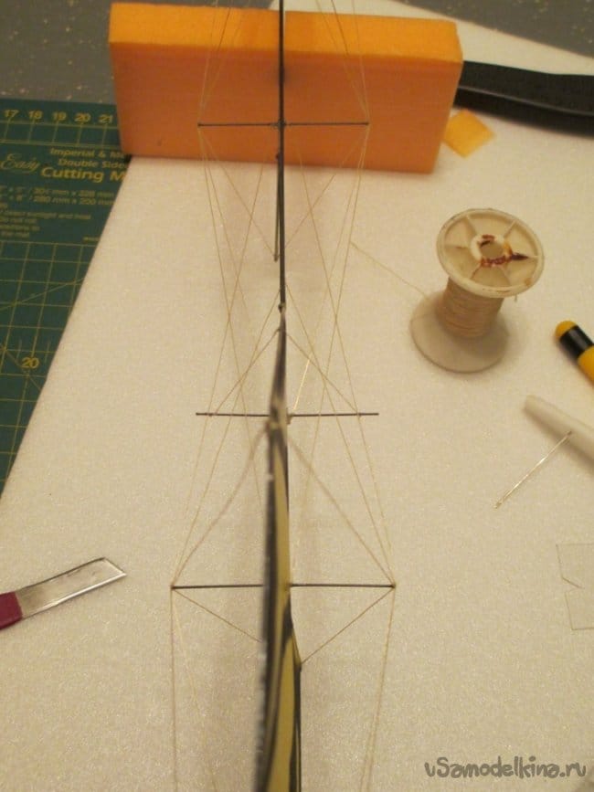 В сто первый раз проверяю правильность изготовления этой части модели. Изготовил из обрезков пенопласта стапель, иначе невозможно работать с такой тонкой и нежной конструкцией. Провязываю новые стыки распушенной арамидной ниткой, уже на стапеле, узелки расплющиваю "супер плоскогубцами".