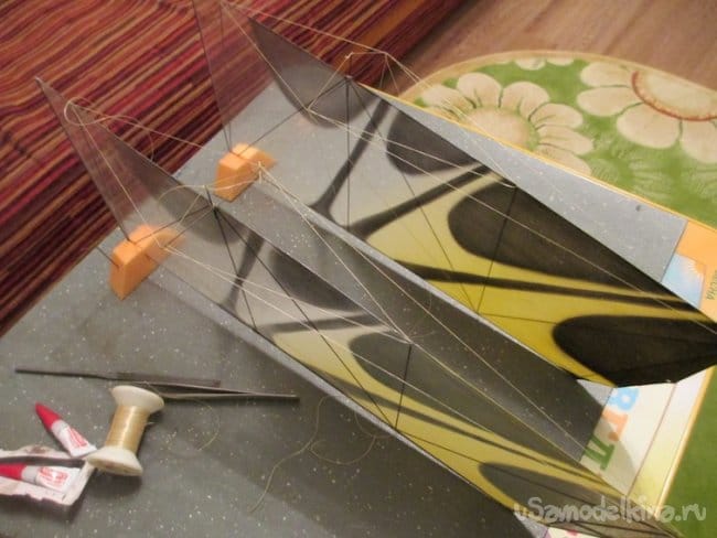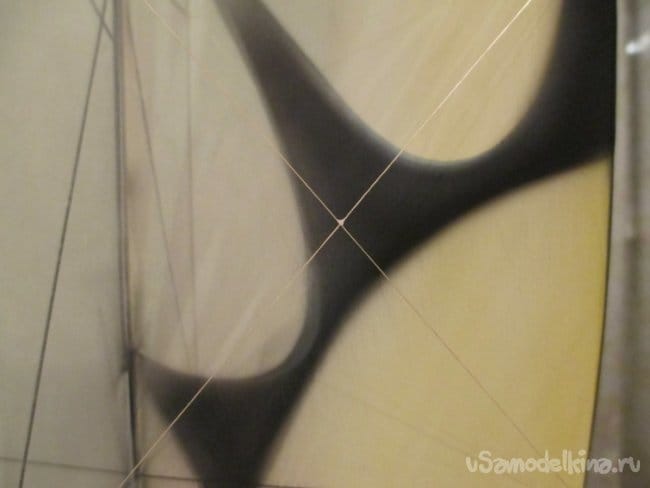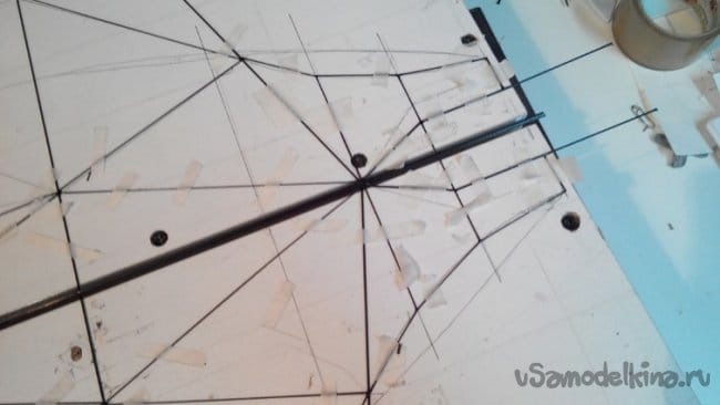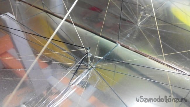 Следующая операция, установка распорок, расчалок. Вариант установки усилений из карбонового прутка толщиной в 0.5 мм, мне совершенно не нравится. Метровые прутки весят примерно два грамма. Установка большого количества усиливающих элементов добавит неприемлемое количество веса. Решил установить растяжки из арамидной нити.