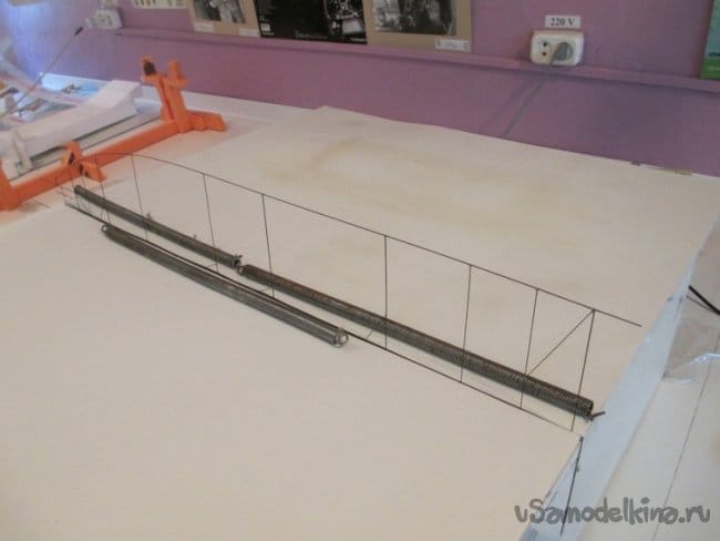 Носовая часть фюзеляжа представляет весьма сложную конструкцию. Длинные горизонтальные прутья-балки это моторама. Поскольку известны размеры двигателя, они подогнаны под него. Толстые, диаметром в 1мм, походят по всей носовой части и упираются концами в основную балку. Самые прочные элементы всей конструкции.