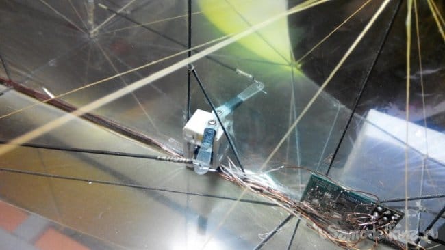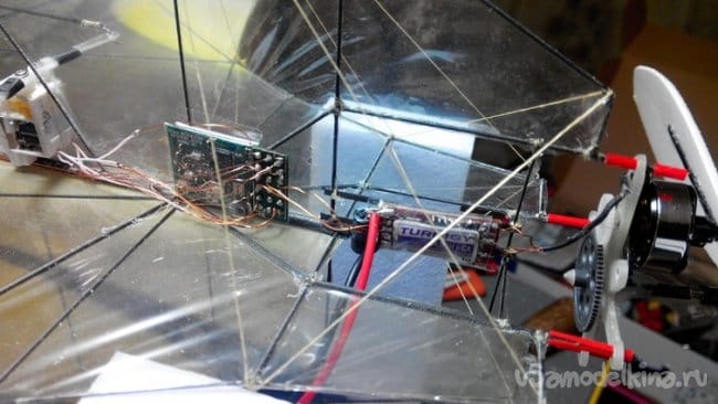 На элероны установил два легких сервопривода. Немного добавил веса, зато расширил возможности настроек весьма значительно. Ободрал приемник, даже снял все контакты, и припаял провода управления прямо на плету. Антенны тоже снял, на небольшом расстоянии в зале приемник работает нормально и без них.