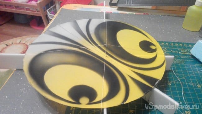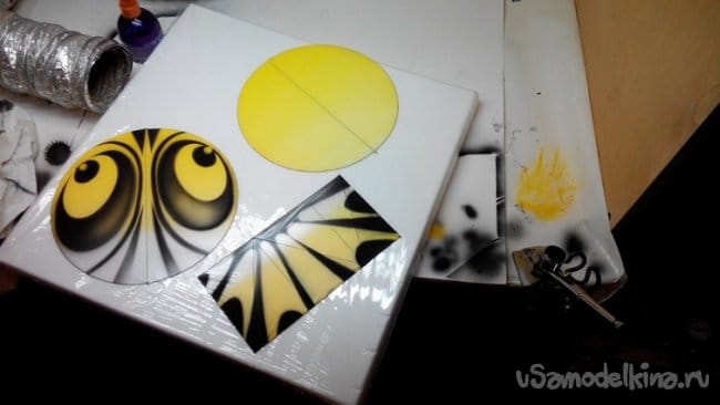 Поскольку пенопласт имеет толщину в 3мм, аэрограф держу строго вертикально, нужны четкие линии перехода цвета.