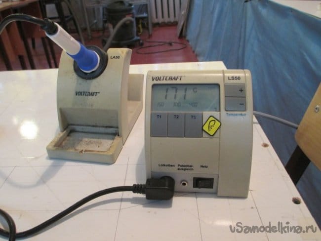 По возможности стараюсь не разрезать прутики, сгибаю прямо на чертеже паяльником. Угол изгиба делаю немного больше чем нужно, при остывании возвращаю в нужное положение, Что позволяет не проявляться остаточной деформации. Все места сгиба прокапываю циакрином. На жало паяльника подаю температуру в 171 градус. Если поставить 172, ничего не получится
