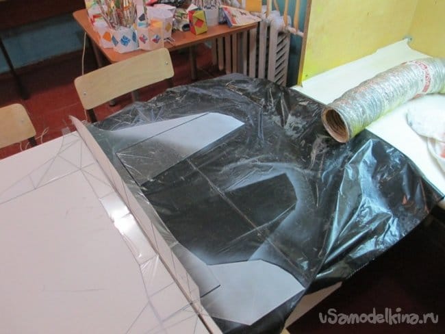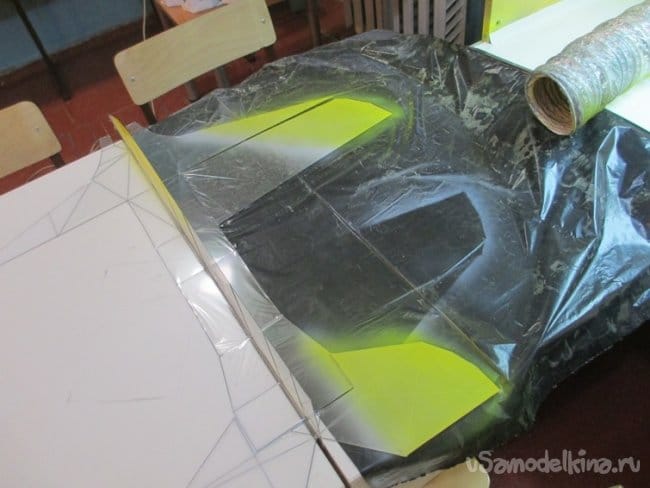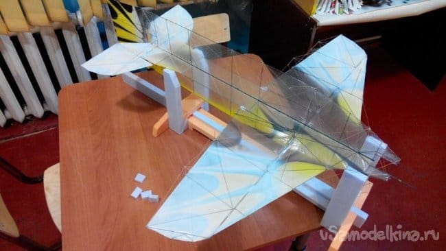 Устанавливаю каркас на стапель, закрываю крылья бумагой, придавливаю грузами от смещения. Наношу клей на каркас. Затем снимаю защитную бумагу и убираю каркас со стапеля. Снимаю одну часть столика и на край прикладываю пленку. Оставляя примерно 5мм на загиб. Тщательно расправляю и электризую. Каркас с клеем накладываю на пленку, свободный край её загибается и приклеивается к основной трубе каркаса. Получается достаточно ровно. И эта непростая операция получилась с первого раза.