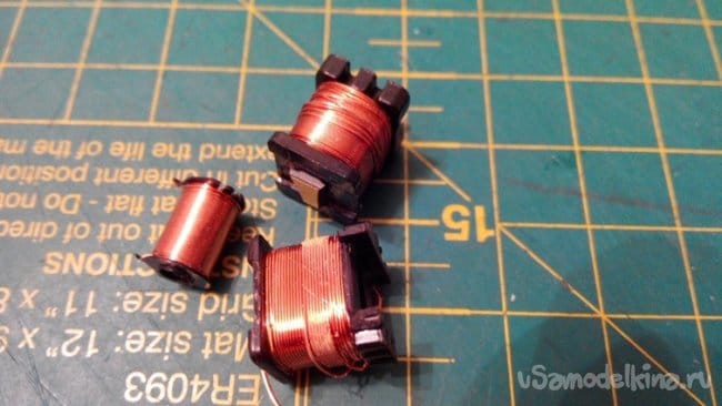 Начинаю устанавливать их на заранее подготовленные места в каркасе фюзеляжа. Провода удлинения провожу лакированной медной проволокой. Поскольку проволочки одинаковые помечаю малярным скотчем, чего и куда паять.