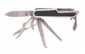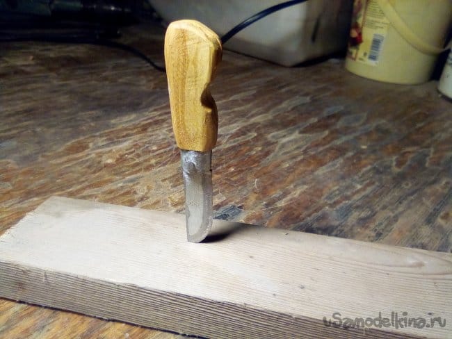Сталь взял от старого Советского прибора, по толщине примерно 1,1 мм. Из него сделал клинок и несущий укрепляющий цилиндр. Колено сделал из укороченного гвоздика, а рукоятку из ветки яблони. Дерево обработано олифой. Силой трения клинок туго выходит из рукояти, держится в крайних положениях уверенно.