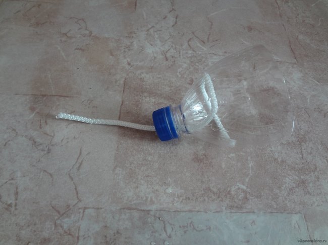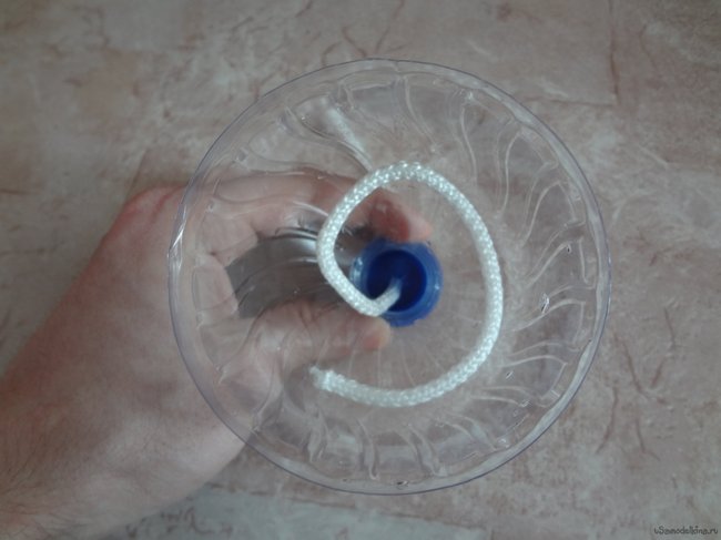 Вставляем веревку в пробку и заворачиваем обратно в верхнюю часть бутылки.