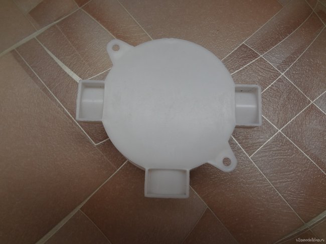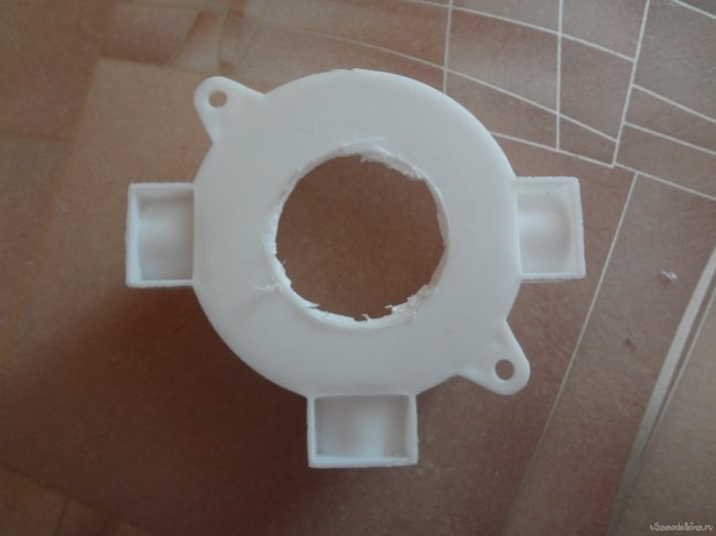 У распред. коробки чаще всего имеется три отверстия для электрических проводов. Они всегда имеют так называемую глушку, которая легко снимается с помощью ножа или отвертки. Две нижние как видно на фото пригодились в качестве ножек. На третьей я снял глушку (предварительно проверил герметичность путем включения кулера и все пропуски в корпусе распред. коробки заклеил скотчем) и подсоединял отлично подходивший к ней обыкновенный полимерный шланг диаметром 10 мм, другой конец которого выводил на улицу через окно. Так как чаще работаю с минивытяжкой на застекленном балконе, то длина шланга состаляла всего 1 м. Мощности кулера достаточно. При выборе кулера и блока питания советую исходить из будущей длины и диаметра выходного шланга (точных методик рассчета нет). Чем больше размер кулера и выходное напряжение блока питания, тем конечно выше производительность. Старайтесь подбирать диаметр шланга максимально маленького размера.