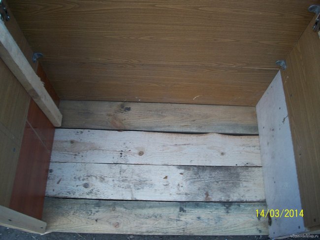 На время прикрепляем двери на место-и занимаемся дном.Так же ,как и с задней стенкой из обапалок вырезаем нужную длину и крепим саморезами,оставляя между ними щели.