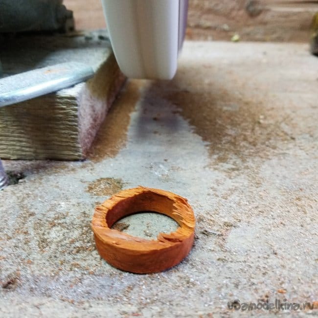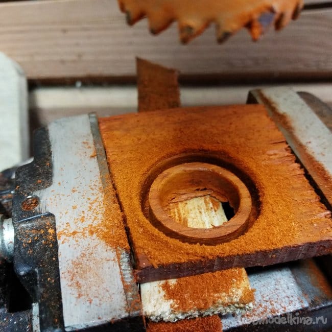 Далее я высверлил внешний контур колечка. Главное до выпадения кольца из деревяшки саму деревяшку не доставать из тисков, а то вернуть как было уже не получится.