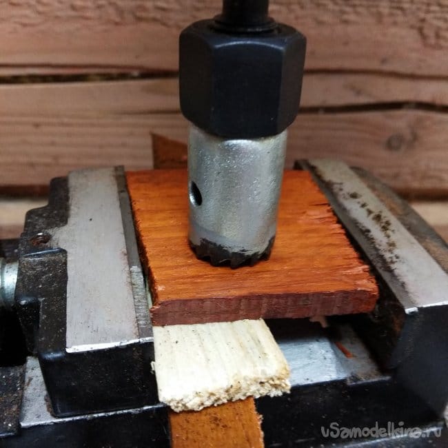 И, соответственно, зажал её в тисках этого самого станка, заранее подложив несколько дощечек для ровности рисунка дерева, и чтобы не повело дощечку во время сверления и не сломало. (Знаю, прекрасно зажал, на века прям).