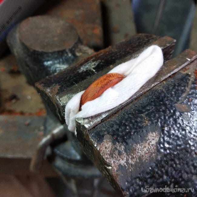 Далее я завернул колечко в тряпочку, аккуратно зажал в тисках, чтобы не сломать, и начал наводить насечки на кольце с помощью старого алмазного надфиля.