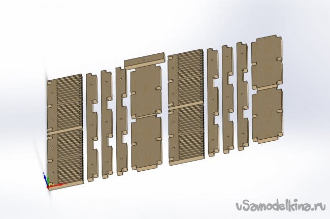 Скачать детали можно тут. В архиве файлы в формате .SLDPRT и .DXF (для лазера)