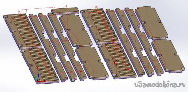 Для этой цели я использую фрезерный станок с ЧПУ. Но можно и лазером. Разница не большая. Просто для сочленения деталей приходится учитывать фрезу (то есть фреза не может выдать прямой внутренний угол, приходится немного врезаться в углы, что бы в дальнейшем не работать напильником или надфилем)