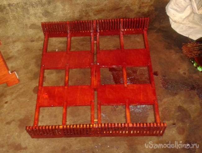 Ждём высыхания клея. Дальше спиливаем излишки зубочисток напильником и покрываем или пропитываем изделие. На фото что ниже я использовал прошлогоднюю пропитку. Густая как лак! Оказалось что крышка лопнула и жидкость постепенно испарялась.. Но это не беда, не такое уж важное изделие