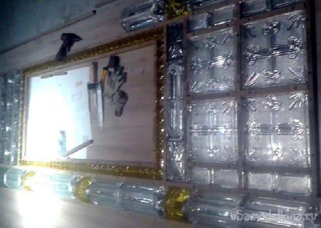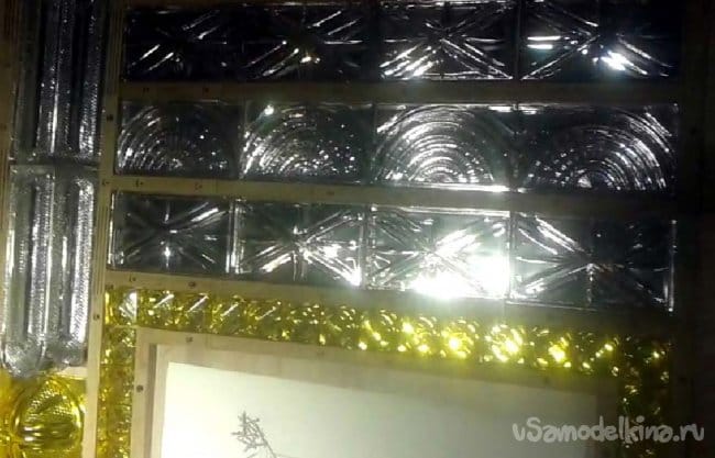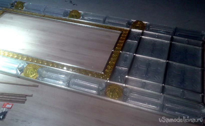 Заменили зеркальную подложку хрустальных плиток. Окрасили некоторые детали. Было решено заменить алюминиевые окислившиеся ламели, которые держали хрусталь на стене, на выкрашенный дуб.