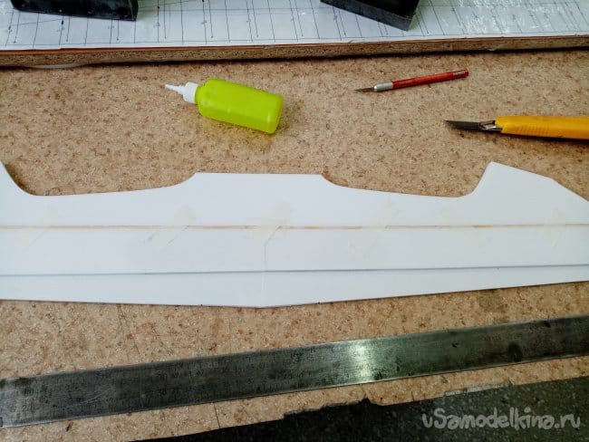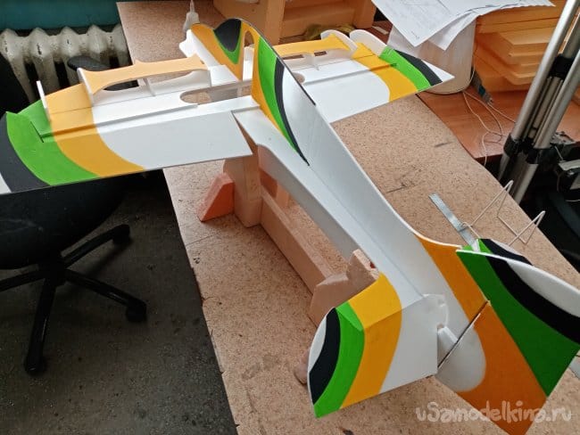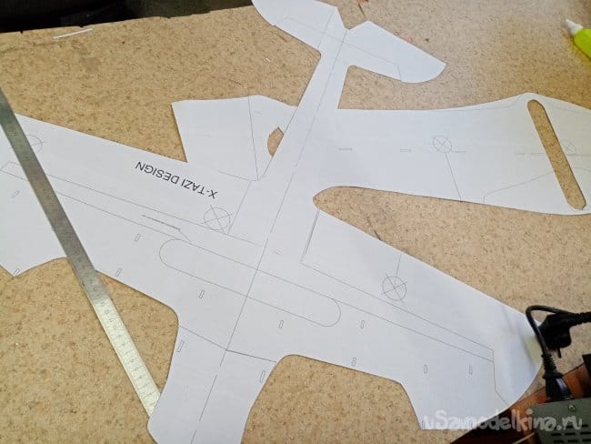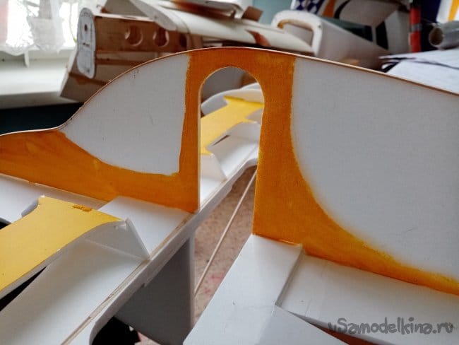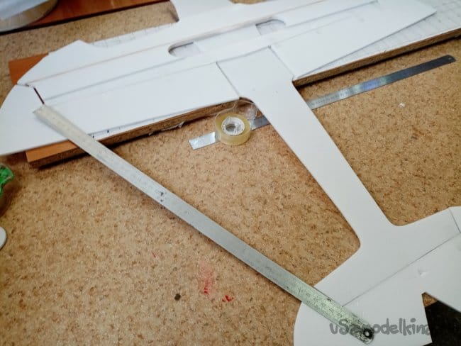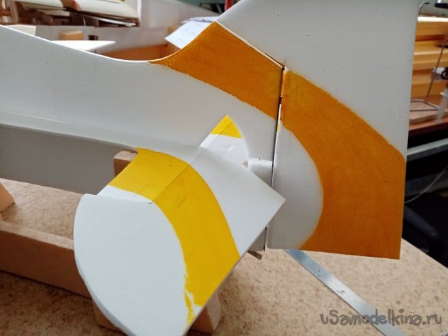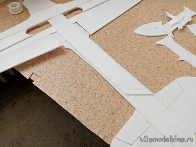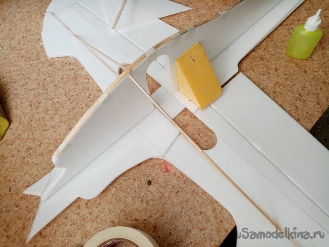 Склеиваю фюзеляж с крылом. Пока все сохнет, отрезаю руль высоты и навешиваю на скотч.