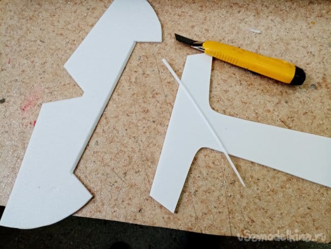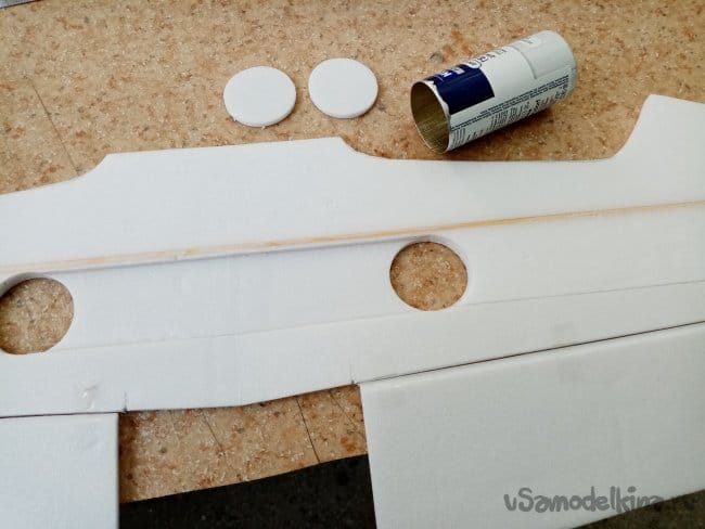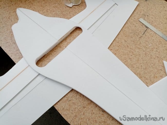 В фюзеляже вырезаю отверстие под винт. Проверяю, все совпадает, накладывая крыло на фюзеляж.