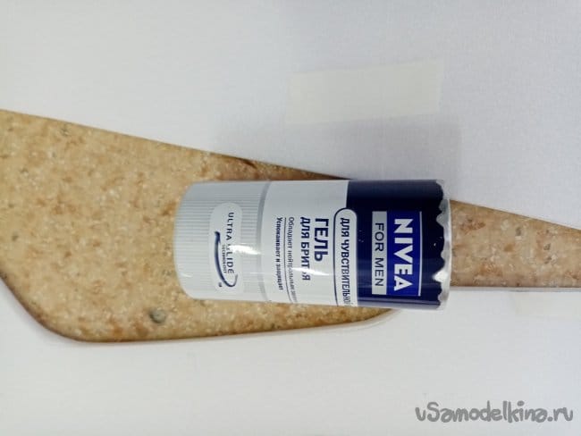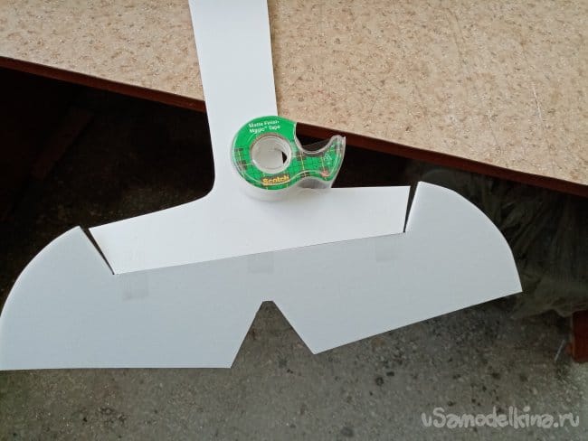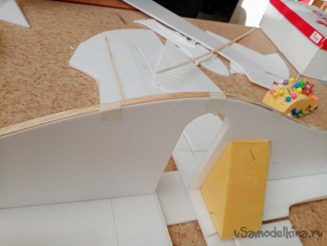 Собирать модель начинаю с нижней части фюзеляжа. Для ровной приклейки на горизонтальную часть закрепляю временные накладки. Поскольку крыло приклеено сверху и образует ступеньку. Приклеенную нижнюю честь фиксирую иголками и треугольниками из утеплителя, со скотчем для защиты от клея. Нарезал разных угольников впрок, сложил в коробочку.
