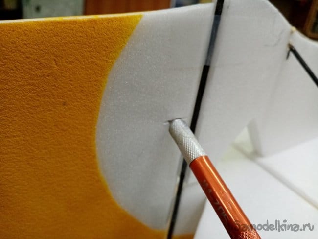 Сразу примеряю размер отверстия под винт в фюзеляже и крыле.