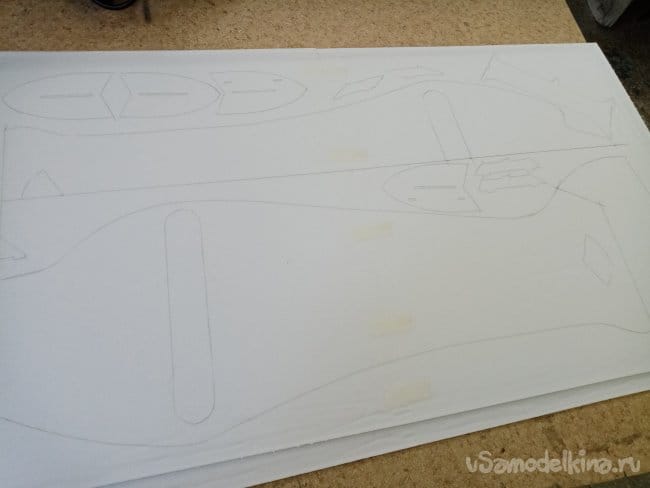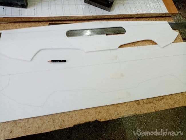 Продвигаюсь дальше в модернизации. Поскольку вариант для полетов на лужайке начинаю укреплять это чудо. Нижнюю пластину фюзеляжа из двух слоев потолочки. На крыло накладку под профиль Фогельмана. Крыло накладное на фюзеляж.