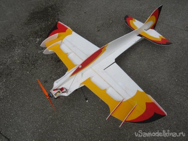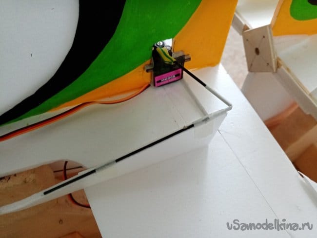 Управление на руль высоты и руль направления на тягах из толстых ниток. Вполне хорошее управление, не сколько не хуже чем из рыболовной плетенки. Её можно оставить для матчевых моделей.