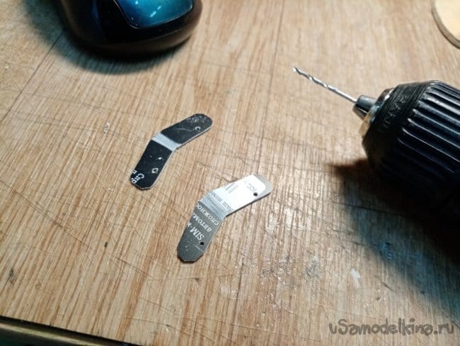 Кабанчики изготовил из пластиковой карточки. Вырезаю ножницами, маленько лохмачу места приклейки крупной шкуркой. Сверлю отверстия для ниток тяги. Корректирую размер. Прорезаю отверстия для монтажа. Вклеиваю в рулевые поверхности на титане.