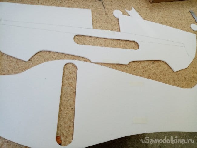 Отрезаю жеванный край потолочной плитки примерно на 4 см, склеиваю две пластины в стык и фиксирую малярным скотчем с двух сторон. Затем по шаблонам расчерчиваю детали. в этом случае не обязательно дожидаться пока схватятся половинки накрепко. Черчу, режу, малярка держит и половинки продолжают клеиться и крепчать во время этих процедур.