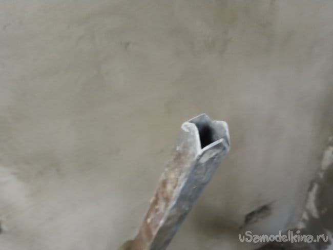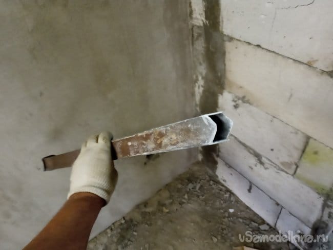 Начал я с пробивки отверстия. Стены моей пристройки выполнены из газосиликатных блоков, так что, пробить в них отверстие значительно быстрее и проще, чем в стене из кирпича. Сначала я, из помещения, при помощи перфоратора, длинным буром просверлил много отверстий там, где хочу устроить ветнканал. Потом, из обрезка профильной трубы, попавшейгося под руку первым, действуя болгаркой, за две минуты сделал вот такой инструмент: