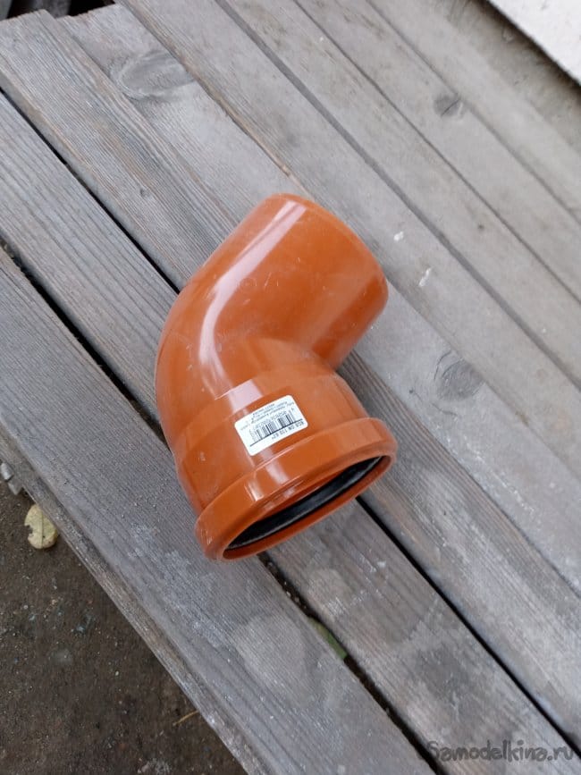 У меня были и серые, полипропиленовые трубы для внутренней канализации, но эта труба имеет более толстые стенки, поэтому я решил использовать её. Съездил в сантехнический супермаркет и купил для этого диаметра вот такой отвод:
