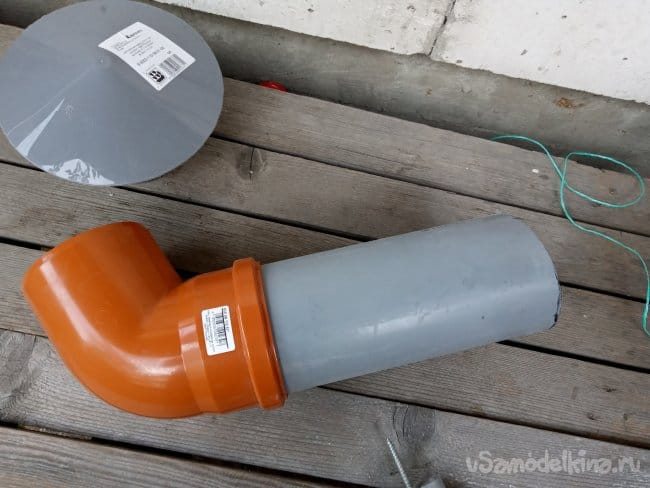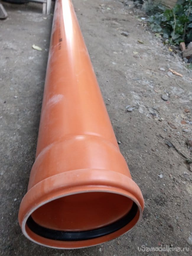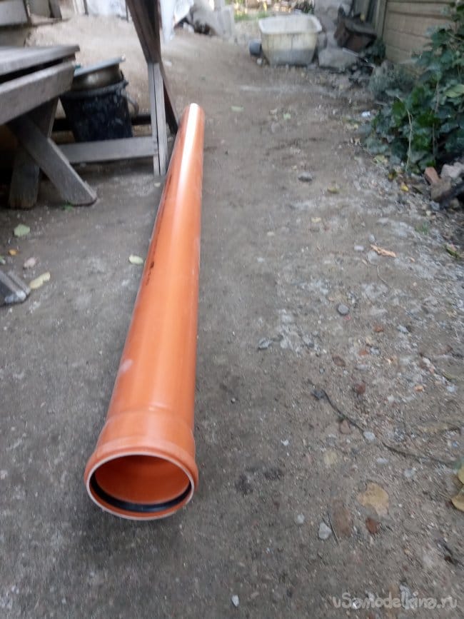 В качестве вертикальной трубы я решил использовать трубу для наружной канализации, диаметром 110 мм и длинной 2 м, которая у меня имелась в запасе: