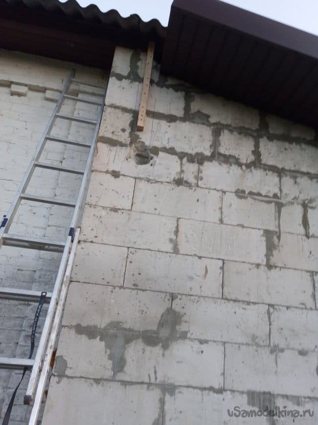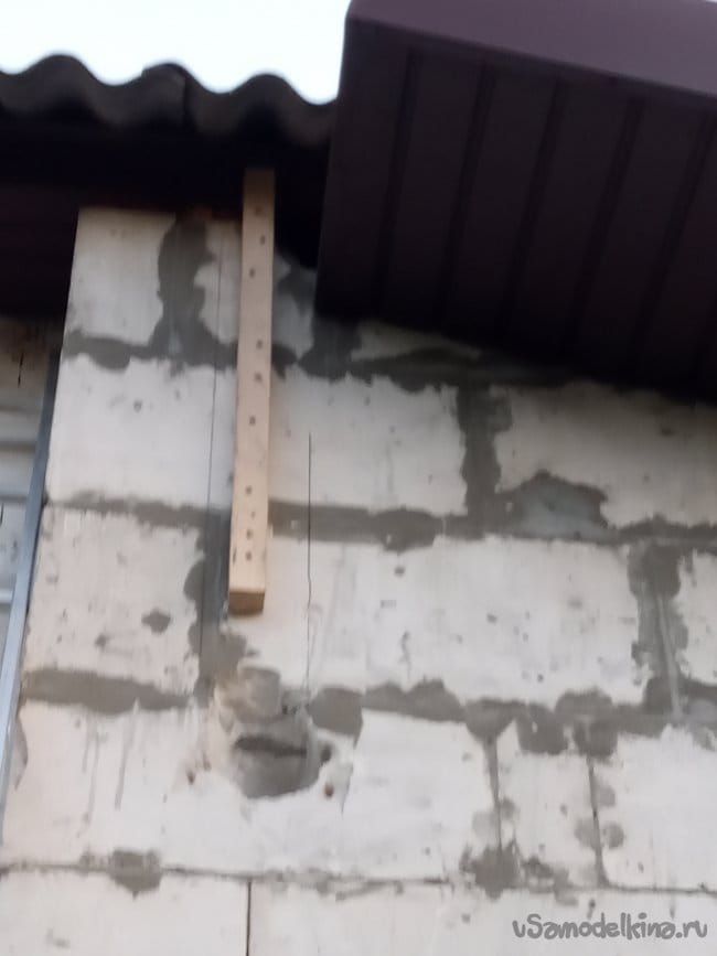 Но на этот раз я подумал, что даже такого крепления может быть не достаточно. Ведь труба будет закреплена только на меньшем участке её длины, а основная её часть будет испытывать серьёзные ветровые нагрузки при шквалистых ветрах, которые бывают в межсезонье! Поэтому, чтобы укрепить брусок "на отрыв", я насверлил в бруске отверстий, в хаотичном порядке наклоняя сверло под углом в разные стороны, и вогнал сквозь эти отверстия много длинных (150 мм) шурупов. Шуруп в газосиликате держит очень слабо, но мноржество их, закрученных "врастопырку" в разные стороны, уже держат хорошо.