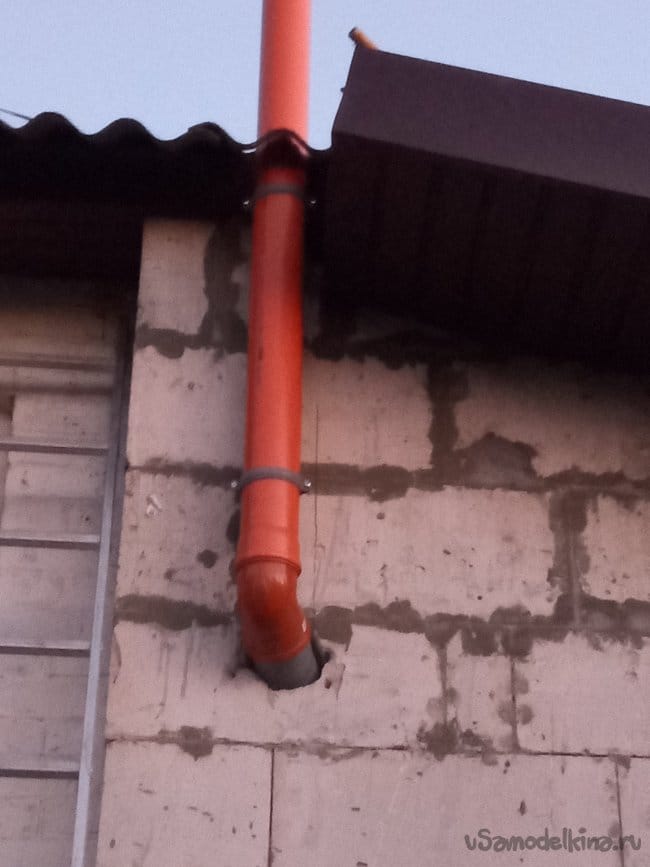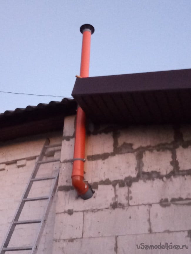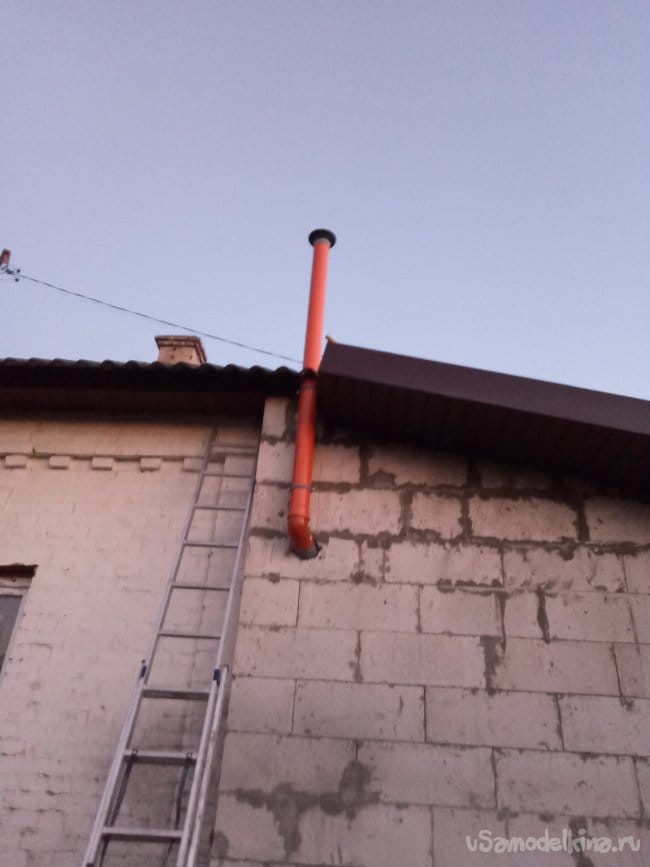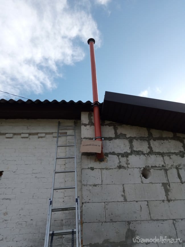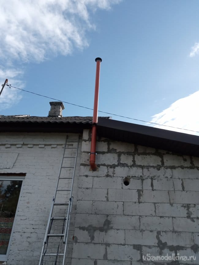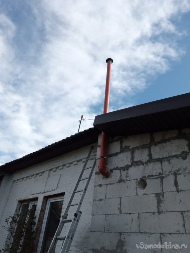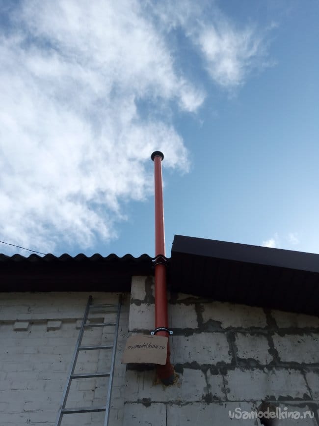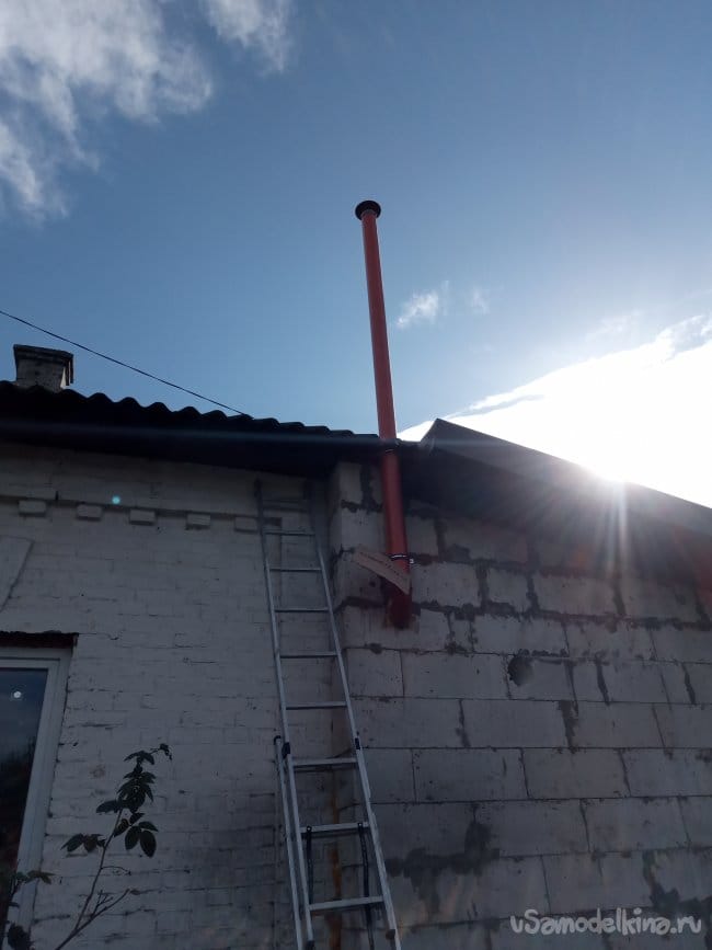 Порывшись в запасах, я нашёл метровый кусок такой-же трубы. Опять полез на крышу и удлинил трубу на метр. Теперь над крышей торчит не два, а три метра.