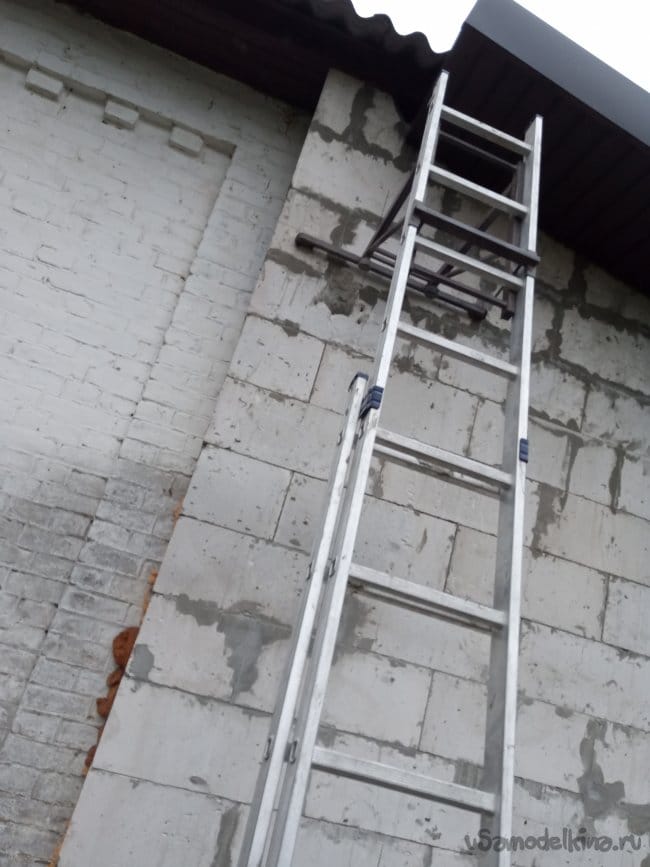 Ну что ж... Оставить в таком виде не получится - труба должна быть цельной!! В запасе более длинной не нашлось, поэтому пришлось переодеваться и ехать опять в магазин. Там я купил такую-же трубу, но длиной не два, а три метра. Заодно, на всякий случай, решил заменить и пластиковый крепёж на металлические "КТРы". Я и раньше немного сомневался в целесообразности использования креплений из ПВХ на улице, но решил, что для временной конструкции их хватит. Но теперь, когда труба будет выше, нагрузки больше, лучше сразу сделать с запасом прочности. Заменить всё не составило особых проблем - лестница так и стояла, отверстия под шурупы крепежей уже обозначены (в новых они просто более толстые). Извините, процесс замены не фотографировал: