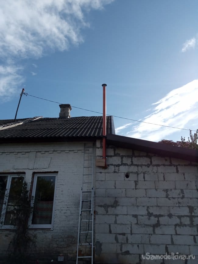 После чего всё смонтировал, пропустив трубу сквозь свес крыши через отверстие, пробитое в шифере. (Кровля всё равно, тоже будет меняться)))):