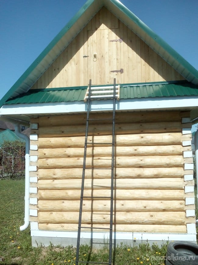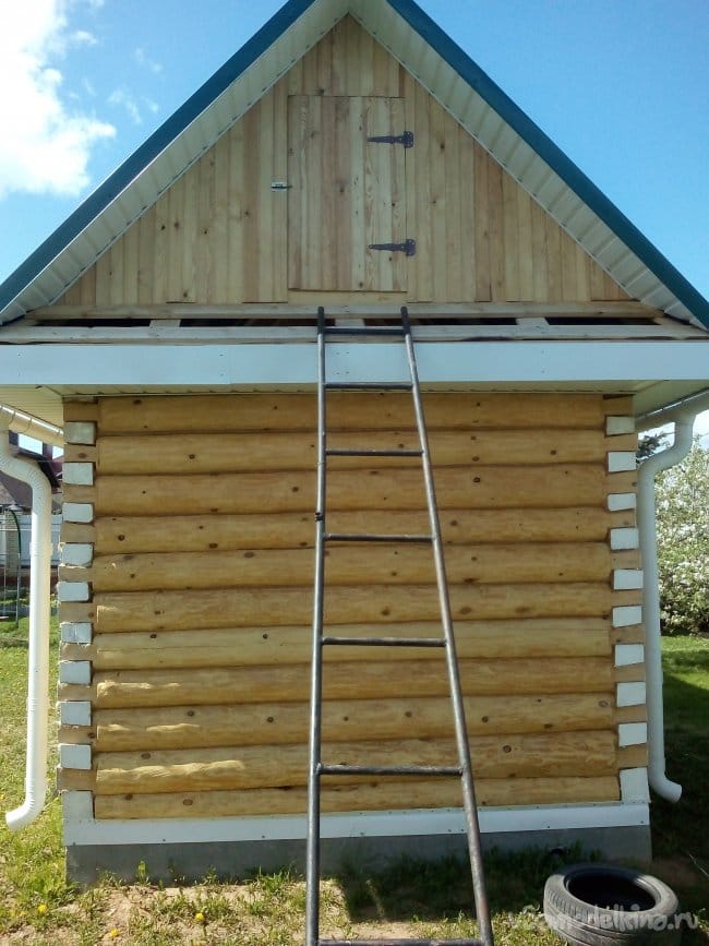 В предыдущей статье про установку сруба, я делился раскройкой ОСБ для фронтонов, но у меня долго лежала «до лучших времен» сосновая вагонка, которая была обработана лепестковым кругом номером 80 и…… получилось - вагонка стала лучше новой. Далее все просто, крепим к крайней стропиле поперечную балку для жесткости с одной стороны и подготовку для входа на чердак с другой стороны крыши по фронтону, далее не спеша начинаем зашивать фронтоны вагонкой, учитывая температурный зазор между досками. Навешиваем входную калитку на накладные петли и покрываем вагонку защитным составом.