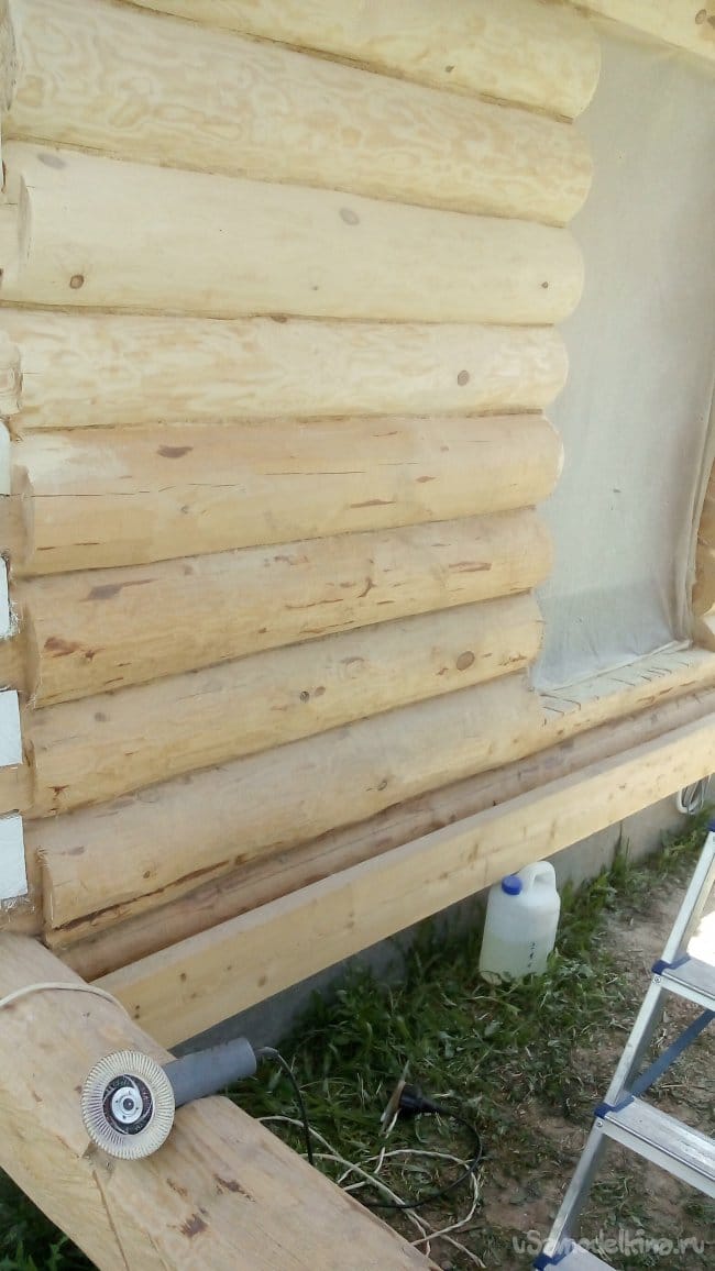 Начинаем не простой, трудоемкий и не совсем «чистый» процесс, приданию срубу струганного вида.
