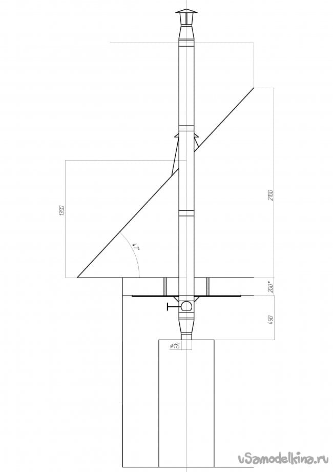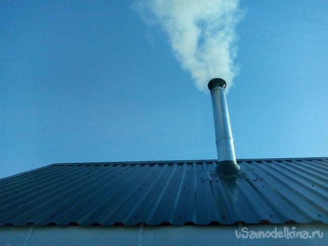 Дымоход покупал в специализированном магазине, сэндвич трубы привозили под заказ. Советую к этому вопросу подойти основательно. трубы и комплектующие получились не дешевые, но на пожаробезопасности экономить не стоит. Сэндвич труба, ее внутренняя часть – нержавейка толщиной 1мм, наполнитель Супервул. Потолочный проход во внутренней части ни чем не забивал, сделал это для того, что б не перегревалась труба в месте прохода. А вот между потолочными досками и отражателем с «рубашкой» проложил базальтовый иглопробивной материал (БИМ), отличный материал в качестве термо изоляции (защита от пиролиза дерева). Обращаю внимание на то, что некоторые ради экономии денег покупают не дымоход, а воздуховод, У воздуховодов наполнитель совсем другой и не предназначен для использования дымоходов (выгорает). Для прохода кровли использовал силиконовый «Мастер флэш», очень удобно с ним работать.