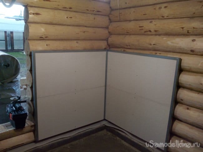 Далее нарезал по 1200мм профиль, который используется для изготовления коробов под гипсокартон, в количестве 12 штук, потом вставлял один в другой, чтобы получалась, как бы квадратная труба и прокручивал по бокам саморезами с прессшайтой. Получилось 6 каркасных заготовок, которые по краям и посередине закрепил на горизонтально расположенные листы «Магнезита». В задней части каркаса сверху просверлил отверстия, и вся конструкция просто одевается на 3 самореза вкрученные в бревно сруба. Удобно потом регулировать уровень «картин» по мере усадки сруба, т.к. они легко снимаются.
