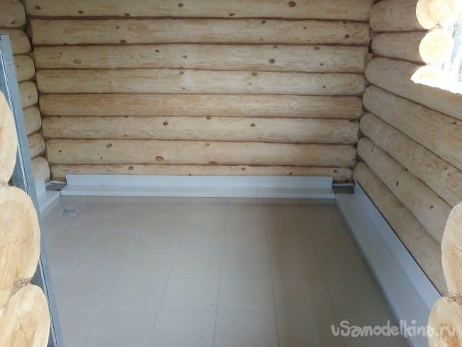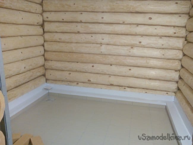 Так же по первому венцу и закладным бревнам на стыке с фундаментом, установил L - образные, заказанные заранее фасонные изделия, из белого плоского металлического листа, через D – образный резиновый уплотнитель. Сделано это для того, чтобы отвести стекающую по бревнам воду от стыка.