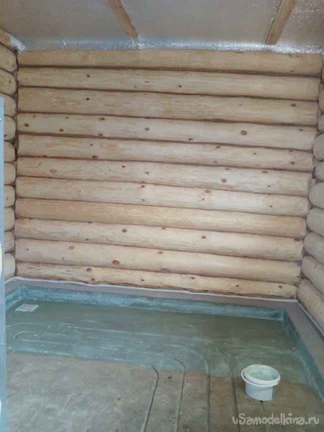 На фото видно, что пока стяжка набирала крепость я смонтировал фальшь потолок. Так как сруб получился высокий (см предыдущую статью), то решили сделать как бы двойной потолок. Фальш потолок сделан из старой вагонки, подшитой к стропильной части, выше бревна – балки (перевода) и снизу «пристрелян» фольгированный изолон.